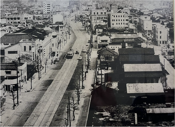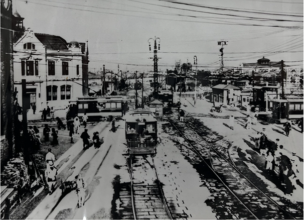 明治41年には市外電⾞が敷設され、路線の⼀部が、四ツ橋筋を通りました。