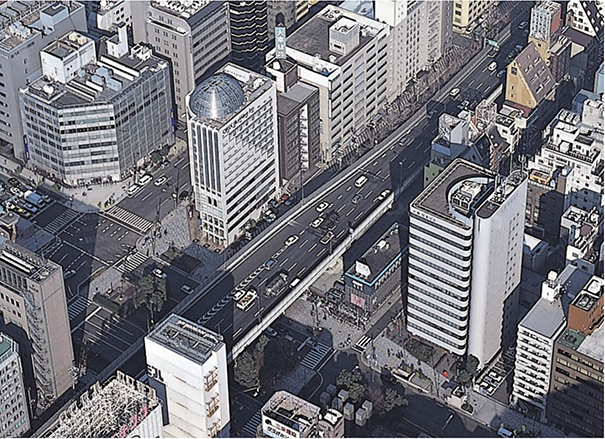昭和60年頃の四ツ橋の様⼦。横堀川・⻑堀川は埋められ、⾼速道路が縦横を⾛る街並みへと変貌しました。